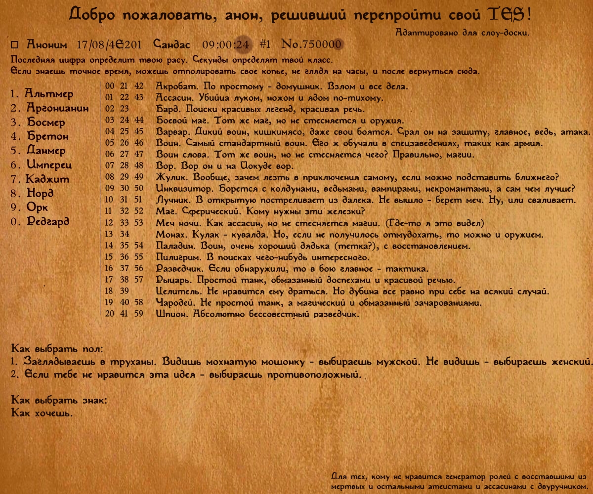 Попытка возродить мертвый тред. Приветствуются и старички, и новички, и аутисты всех мастей, и лесорубы-выживальщики и хилочки-бретоночки. Делитесь памятными моментами из своих ролеплей-прохождений Древних Свитков, где вы отыгрываете персонажа. Придумывайте билд, пофантазируйте о бэкграунде своего персонажа итт, а также подсказывайте другим анонам. Также можете пилить здесь пасты о ваших похождениях, в виде какого-то пересказа событий или своеобразного фанфика о вашем персонаже, примеры в треде были нередки. Конечно же, кидайте скриншоты. Делитесь модами, которые подойдут для вашего отыгрыша, будь то допотопный Ordinator с перками монаха или Skyrim Conquest для желающих стать ярлом или даже верховным королем. Добро пожаловать!