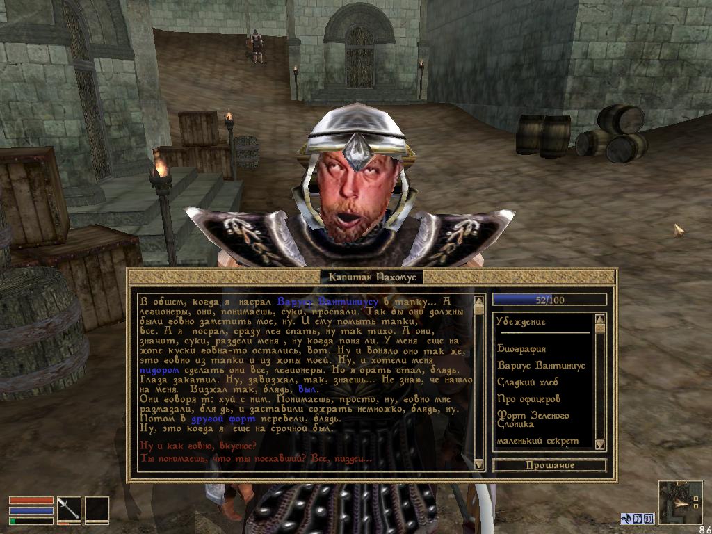 Я говорю, имперский легионер Умарил, блядь. Мы просили один Нумидиум вчера, всего один Нумидиум чтобы нахуй мы... и сегодня бы мы не отправляли 23 гроба, их было бы бля в половину меньше, один Нумидиум просили! С десяти утра до шести вечера 13 Утренней Звезды я просил один Нумидиум, вот нам сказал Тайбер Септим (он Император, блядь) пусть он знает, блядь, нахуй, пусть они Прорыв Дракона они так крутые, блядь и дай Девятеро чтоб эта окровавленная записка как-нибудь вышла, блядь, к Вороному Курьеру, блядь, пусть нахуй все знают, блядь, что нам 1 Нумидиум пожалели вчера из-за этого мы нахуй 23 уже трупа имеем, 30 мы еще на нашли. 30 наших ребят, блядь, нахуй, а мы все офицеры, блядь... Сегодня мы отправили парня одного у которого 2 грудных ребёнка... 2 близнеца блядь... пиздец! Они сироты нахуй. И этот Септим, блядь, ни Шор, ни Исмир, ни Талос, ни хуй знает кто блядь, они хуй позаботятся о них. Он сука не только блядь... он блядь не только (дай! где сиродильский бренди? есть?) Он пообещал нахуй, что выходит Нумидиум, выходят блядь. Наши ребята там ждали в Морровинде блядь... ждали сидели нахуй. Он хуй Нумидиум дал, сначала сказал что вышел Медный Бог, потом хуй там Нумидиумов было, блядь. Потом блядь наших опять ебошили, опять запросили, Тайбер Септим вообще съебался отсюда (ни единого болта практически) хуй кто вышел, блядь! Ёбаный в рот (у нас уже не было заклинаний восстановления запаса сил) он броню обещал, всё обещал... хуй кто прислал, блядь! Пидарасы всё блядь... гондоны... (все выпили?) 15 человек и 2 боевых мага... БМшки, которые прикрывали и 2 адепта школы восстановления ушли которые за убитыми и раненными... Это ничего! По сравнению с тем что... там это долбили по нам с четырех домов с разных сторон. Работали не только маги, но и Мораг... Мораг Тонг! Я скажу так... (это какой-то маразм был!) Вчера когда мы блядь... вытаскивали нахуй убитых и раненных блядь, вытаскивали убитых и раненных, мы потеряли одного блядь нахуй убитым блядь нахуй. Ординатор снял, блядь, копьём в голову и двух блядь нахуй раненных... наших ребят, блядь. Но слава Девятерым у них в руки ранено. А этого парня в голову, мы не довезли до сюда, до Форпоста... он умер, блядь. И сегодня, блядь, 16 числа Первоцвета отправили первым нахуй двух первых. И, блядь, в 18 Утренней Звезды отправили 11 человек ещё и ещё нахуй лежит 13 человек наших здесь. Наших только одних легионеровцев... Не считая то, что там навалили. Спасибо товарищ Тайбер Септим!