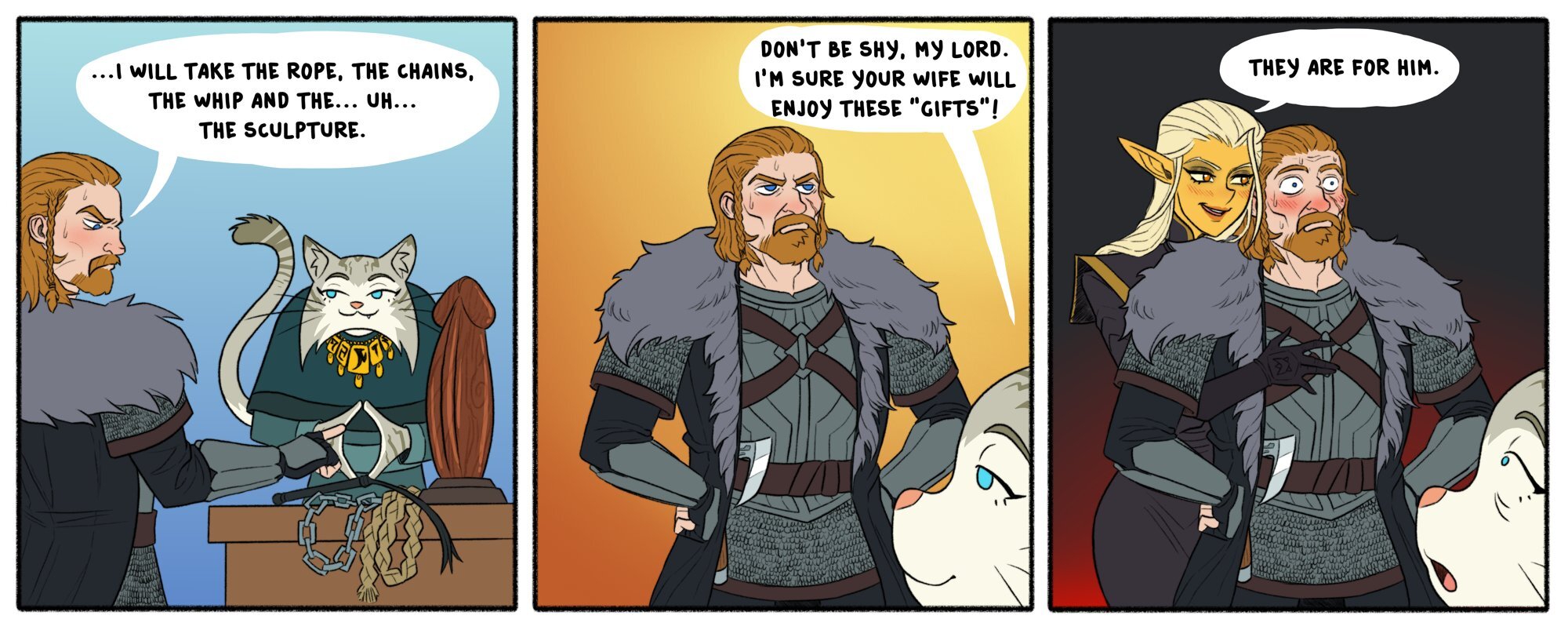 Залез пьяный норд на башню белого золота, неудачно оступился, сорвался.... Летит, на 10 этаже высовывается рука, хватает его за шкирку: — В рот возьмешь? Норд: — Да!!! Ну талморцы дали в рот и выкинули в окно, он летит дальше, на 8 этаже высовывается рука, хватает его: — В жопу дашь? Норд: — Да!!! Ну талморцы в жопу оттарабанили и выкинули в окно, он летит дальше На 6 этаже его подхватывают, норд орет: — И в рот возьму, и в жопу дам!!! Недовольные талморские звуки: — Опять после Акано и Ондолемара объедки прилетают! Всё же и в рот дали и а жопу оттарабанили. Так и получилось, что Ульфрик Буревестник был спасён, но без талмора уже не мог.
