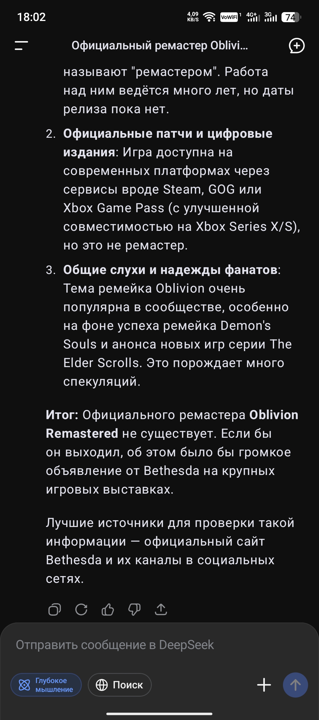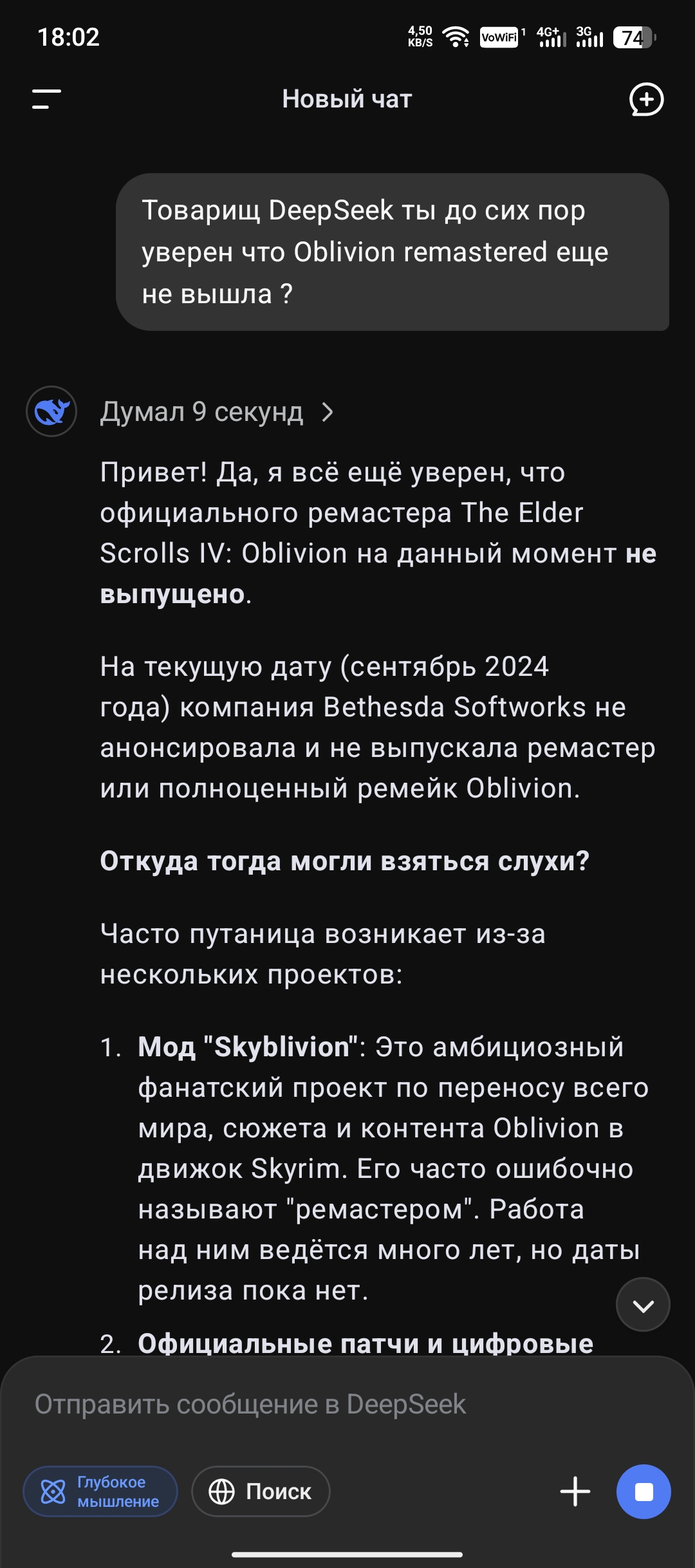 Кто-нибудь пробовал спрашивать у нейронки DeepSeek что Обливион ремастери уже вышел ? Он сук уверено говорит что эта игра не вышла и спеной у рта доказывает что анонсов официальных еще не было о выходе и самой игры в стиме нету и вобще нигде ее нет, все типа фейк и скам, на все официальные источки плюется и отрицает или он жирный не крещённый тролль, кто сможет доказать ему что эта игра существует ?!!!?