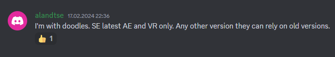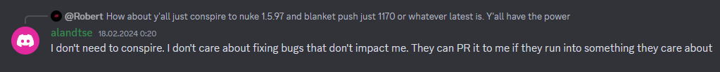 На совместимость между всеми версиями CharmedBarion угробил невероятные силы, но времена меняются, он уже не занят NG так, как раньше. Сейчас набирает популярность форк alandtse, который используют втч Дудлз и Ершин, но вот тебе подводный камень: Алану похуй на старые версии 1.6.Х, он поддерживает VR, 1.5.97 и последнюю 1.6.X (сейчас 1170). На реддитах пишут "да откатывайтесь на 640, всё ништяк", но авторы - живые люди, и у них есть планы. Второго CharmedBarion, который сложит свою голову ради спасения всех, на горизонте нет.