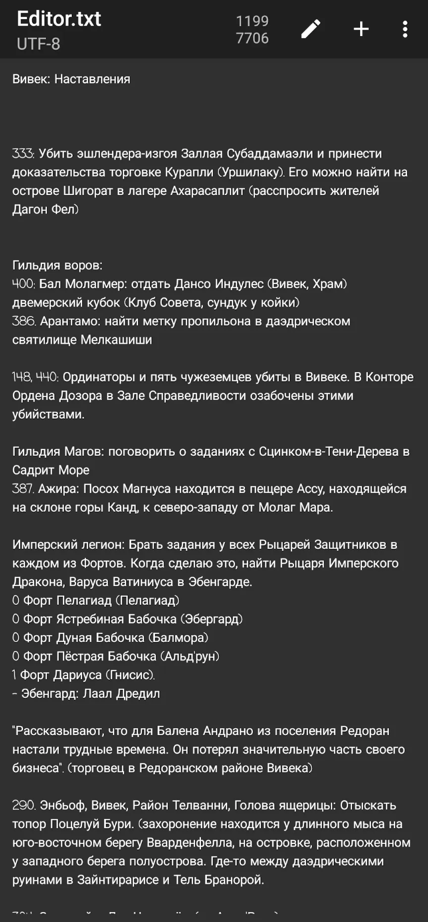 Забей. Тебе нужно в Вивек. Ты должен совершить великое паломничество - само себя оно не совершит. Ты станешь патриархом вся Моровинда. Паломничество многому научит тебя, и, вернувшись из него, ты будешь совсем другим. Прочти о паломничестве. У него много условий. Одно из них - ходить ПЕШКОМ. Многие места требуют подношений. И да, свечи, купленные вне храма, прости, зелья, сваренные самостоятельно, в качестве подношений не годятся. Дерзай. После паломничества ты многое поймешь, и я бы советовал отправиться тебе на солтсхейм, попутно вступив в легивон. Там ты сможешь отыгрывать имперского колонизатора-вояку, мотаясь между бюрократами и первопроходцами. Дерзай. Потом три великих дома: Тельвани, Редоран и Хлаалу втянут тебя в свои разборки и дадут построить свою крепость. В конце. Самом. Потом ты какбе спросишь: "Что дальше?". Я скажу тебе, что на дне Вивека, под ареной, есть место, Место, я бы даже сказал. Там Мефала будет говорить с тобой, это великая честь, как ты уже догадался. Мораг Тонг заявит на тебя свои права, и ты пройдешь долгий путь от раба до грандмастера. Ты справишься и многих убьешь, но таков путь. Можешь не убивать, а стать шестеркой гильдии воров. Они тут недавно. Хабаси в туманной Балморе покажет тебе что да как. Есть гильдия воинов и магов, но они чужды этому миру, Чужды этому острову. Ты сам поймешь. Ты сразишься с Гирцыном на севере и победишь. Сразишься с шестым домом, и тем, кому, снится его жизнь, и опять победишь. Пепельные шторма пройдут и барьер падет. Потом ты отправишься в Морхольм и убьешь Бога. И что важнее - убьешь самого везучего босмера в мире. В локализации от 1с писатель при дворе Хелеста Хлаалу скажет эпическую фразу, от которой у меня наворачиваются слезы на глаза: "Рад видеть тебя опять, друг! Я тут пишу понемногу." А один из Её Рук скажет: "Ты её новый пес?". Ты станешь оборотнем, а твой меч будет разгонять мрак самых темных подземелий и пылать как Истинное Пламя. Тебя втянут в разборки вампиров. Помни: Куара не забагованы. Ты встретишь Тель Фира, и найдешь тайник Фаргота. ты нашлешь на Морхольм пепельные бури. Ты найдешь Лжеца. Ты победишь Гренделя, что спит возле Медовых Залов. Ты вернешь украденное Солнце. Ты обгонишь Пловца. В пеньке ты найдешь Ложь, Обман и Смерть 3 или 6 штук. Тебе выкуют латы изо льда, или адамантина, или ты соберешь их. Рьикленги будут без ума от тебя. Скальные наездники тоже. Ты найдешь корабль, что потерпел крушение, но который ни разу не касался воды. Ты сможешь нести Слово Девяти, но как его нести тем, чьи боги живы и ходят среди смертных? Даэдрического арбалета нет! Враги из Темного Братства не дремлют! Скумма - это неплохо. Но нужно больше бренди. "Квада Настра Вадис!" не переводится. Маску Клавиуса Вайла найдешь в руинах на севере острова, где все время дуют моровые ветры. Эшлендером рождаются, но иногда становятся. Дерзай. Гуары милые. Стеклянный шлем похож на корону Саурона. Говорят, кто-то в канализациях Вивека убивает ординаторов. Говорят, шестой дом пробудился. Говорят, в церкви раскол. Говорят, в Империи неспокойно. Говорят, луна-и-звезда убьет Ненеревара. Говорят, что Нереварина убил завистливый Трибунал. Говорят, что если не будет героя, то не будет и подвига.