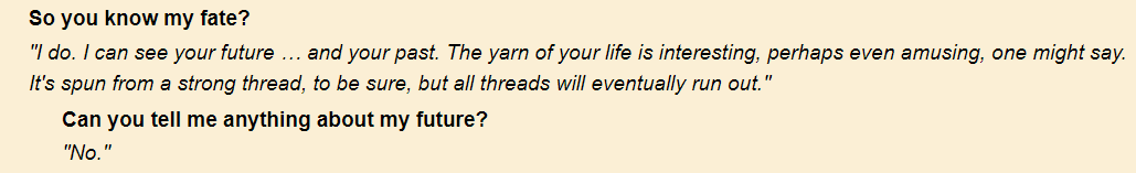 >>1995592 >А потом травят стори что даэдра нарушают условия сделки. Но это так, я поискал инфу на UESP и выяснил что смертные могут так же как и Принцы обманывать и пытаться ускользнуть от ответственности по сделке. Скажем как уйти от сделки с подвохом у Ноктюрнал, пример Хрормир и его друг Дарфанг, Ноктюрнал завладела душой воина и его тень стала чужой, далее он заключила сделку с Хрормиром но тот обманул её и украл Капюшон, на него были наложены чары проклятья но Серый Лис сумел освободить себя при помощи Древнего Свитка, что если и Мерсера Фрея не прельщала судьба сторожить портал в царство теней Ноктюрнал в после и вовсе слиться с его тенями? Как бы он мог уйти от всевидящего Ока Ноктюрнал? Может ответом стало Капюшон коим некогда владел Серый Лис?