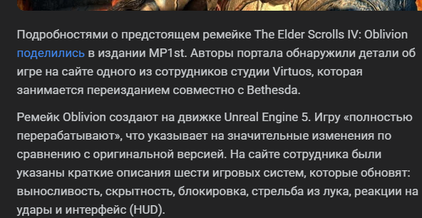 >>1998062 В смысле что обсуждать. Тут день за днём крупицы информации по новому обливиону на UE5. Каждый месяц есть "сливы" по шестой части. Сейчас как раз год когда аудиторию прогревают