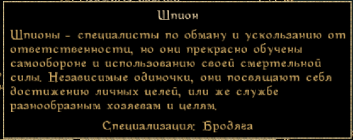 полагаю такое могло бы произойти с вором или жуликом, хотя с последним труднее, ведь жулик может нехило в дыню дать своей секирой и фактически является классом разбойников с большой дороги, требующих скромную плату за проход в хохлы. однако шпион это скользская мразь, виляющая жопой, подтасовывающая факты и переводящая стрелки. как боец он так себе, что то на уровне вора, но развитое красноречие это фактически и есть его профессия - строить диалоги себе в угоду. если бы квамы умели говорить я уверен они бы платили налоги, кай бы их разговорил