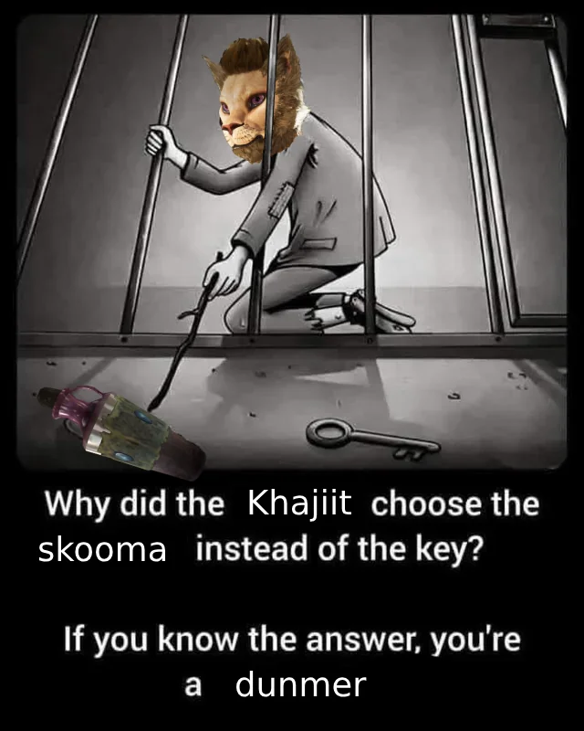 Сидят каджит и разумный мертвяк в камере. У мертвяка отваливается ухо, тот его берет и выкидывает через решетку. На следующий день у мертвяка отваливается нос, тот его тоже взял и выкинул через решетку. На третий день у мертвеца отвалился палец, он его взял и выкинул через решетку тоже. Каджит на это смотрит и говорит: - Я смотррррю ты съебываешь потихоньку