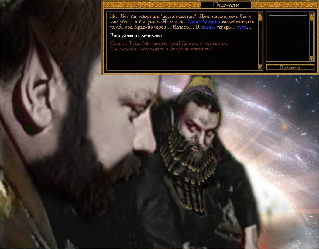 - Ра`Жид, ты ведь из имперского города? Рассскажи, правда, что там все только и делают, что бухают, дерутся, убивают друг друга, жрут скууму, трахаются по кустам, валяются в дерьме и вступают в "Мифический рассвет"? - Какой ещё "Мифический рассвет"?!