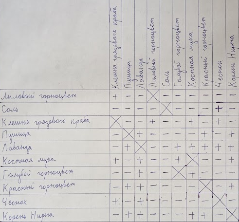 Устроил разбор сундука в своей алхимической лаборатории. Выписал матрицу для 10 самых больших по количеству у меня (либо полно в руинах вроде костной муки, либо растет вдоль дорог). В ходе проведенных экспериментов полностью раскрыл все свойства клешни грязевого краба, красного горноцвета и лаванды. По 3 свойства изучено у корня Нирна, костной муки и чеснока.
