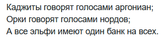 Лучшие кузнецы Сиродила выковали вам броню! Носи! Носи эбонит! Нет, стекло носят! Что такое? И это, блядь, ЧЕМПИОНЫ?! В кожу наряжаются, стекло носят! Эльфийские шлемы таскают. Это, ЧЕМПИОНЫ, я спрашиваю?! Пидоры, блядь, какие-то...