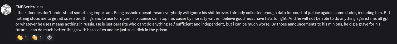 >>2022833 Йоба ало. Это не про тех состояние, даже будь енб в 100 раз лучше чем есть. Цс просто пилит свое по кайфу, кому надо - пользуйтесь. А енб срет вон на весь тред и ноет как бабажидонегр.