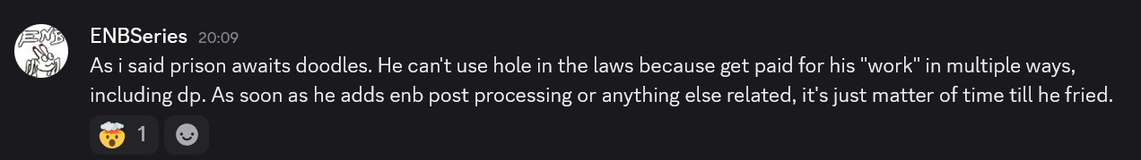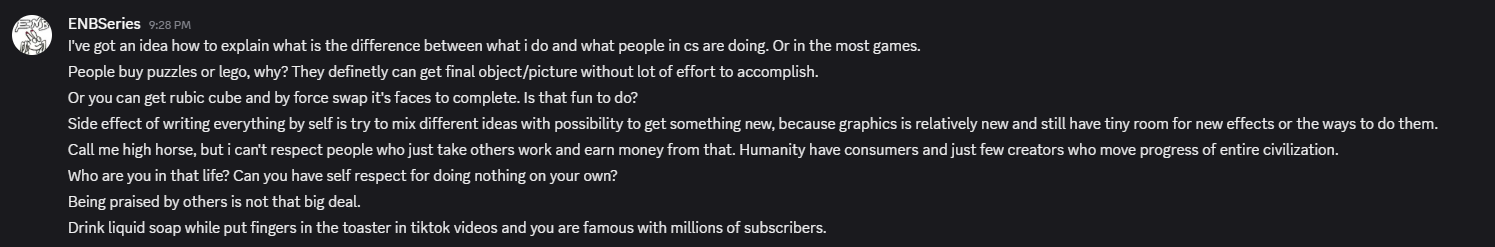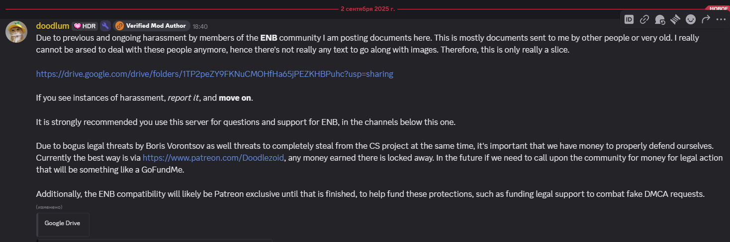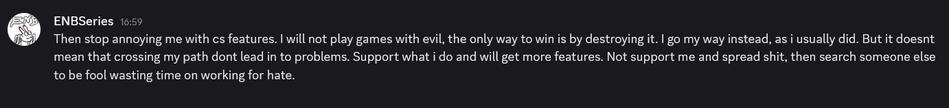 Мало того что они срали на Дудлза несколько лет подряд, они ещё и планируют сделать Скайвинд несовместимым с Community Shaders. Это конечно было бы серьёзной угрозой если бы Скайвинд не был эквивалентом Star Citizen от моддинг сообщества