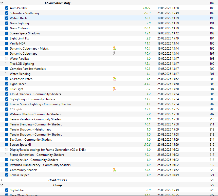 Imgui - мсм Skill framework - mcm Nemesis, pandora - fnis Sunhelm, survival mode - frostfall, rnd, campfire Simple hunting overhaul - hunterborn Dar, oar - fnis pcea Spid - инвентарь и уровневые списки Ube, 3ba - unpb Faster smp - hdt pe Community Shaders - enb mco/bfco - cgo Dismembering framework - maximum carnage BOS - правка записей И всё работает на любой версии игры. Да что там, даже игра не обновлялась! Да и про качество enb и кожи я промолчу. Ещё и игра с enboost и memory allocator работала по сути в х64 режиме! И все моды можно скачать плейграунда!