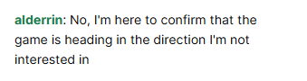 >>2033821 > как надо было Надо было изначально решить, в каком направлении развивать игру, а не метаться туда-сюда, делая при этом минимум работы. > Как будто-бы логично было ответить ему про это, а не про синглы, не? Ты отвечаешь формально, не вникая в суть вопроса. Его запрос: > хочу чистить пещерки, радоваться новой броньке за квест и т.д. Ты правда считаешь, что тесо про это? Да, можно закрасить карты локаций, собрать оверленд сеты, но это не имеет никакой ценности, в этом нет геймплейного цикла. Анону нужен процесс добычи шмота, а не жалкая пародия этого процесса. > скрафтить два сета за три копейки и ходить в них всю игру Ок, с чего ему тогда радоваться выбитым шмоткам? Какой смысл их выбивать? > Анон спрашивал про квестовый и казуальный контент - я ему про него и ответил. Ты пытаешься наебать анона, выдавая оверленд за контент. Эта скучная и беззубая часть игры - одна из причин, почему далеко не все ньюфаги задерживаются (люди, которых я привёл в тесо, даже до 50-го не докачались). Да, в тесо может быть интересно ньюфагу, но как только он почувствует бессмысленность всех своих действий - он дропнет. А синглы можно пройти до того, как станет скучно.