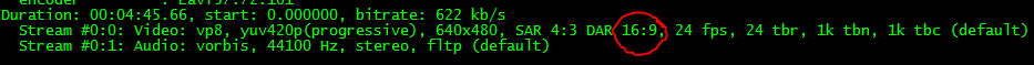 >>55510 А что тебе не нравится с изображением? Полосы? У тебя DAR 16:9 стоит. Пик 1. Например в этой >>55503 вебм DAR 4:3, как и должен быть. Пик 2. Твоё спасение - добавлять в -vf параметр setdar=x:y. Пример: ffmpeg -i webm.webm -vf scale 640:480 -vf setdar=4:3 out.webm
