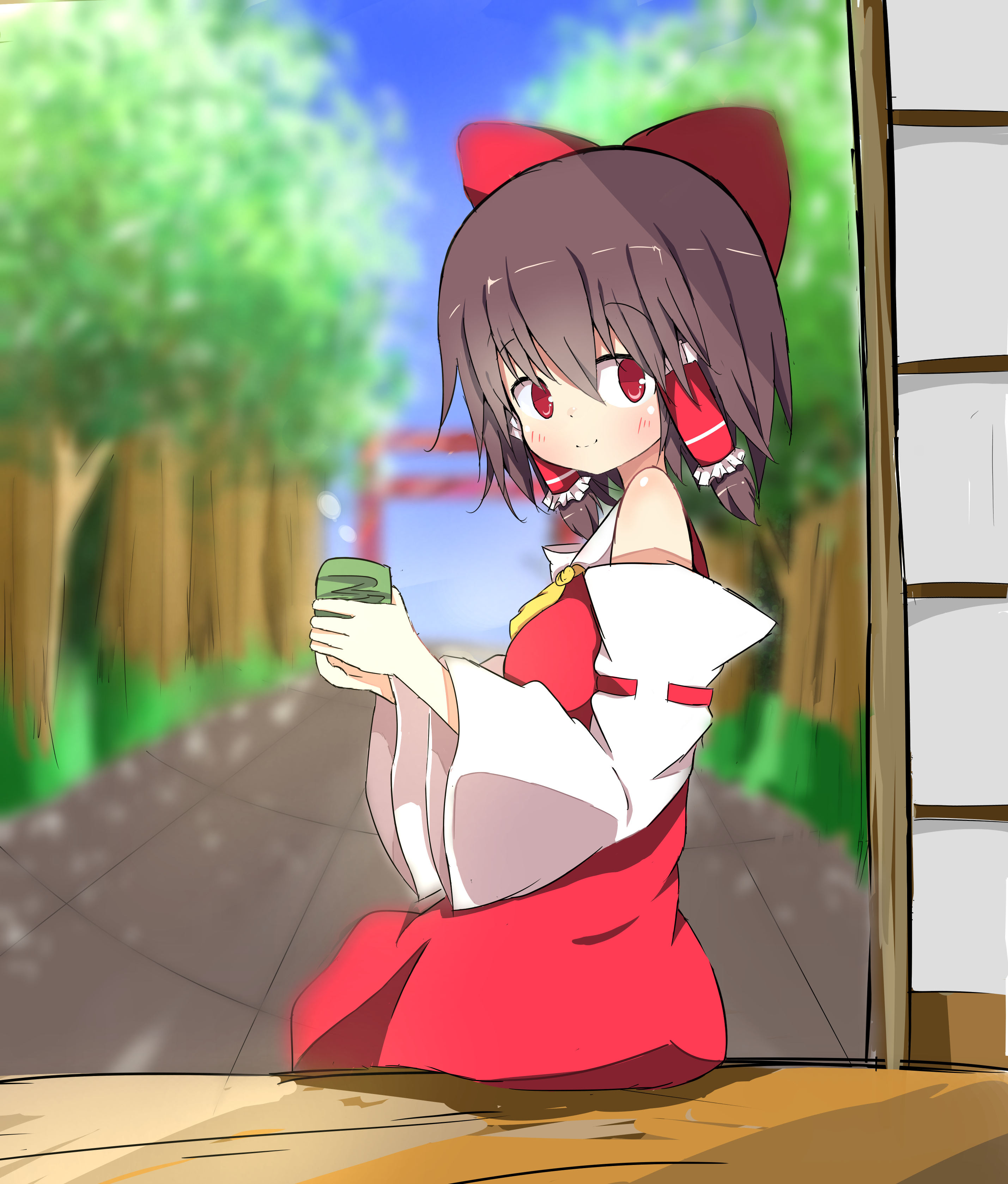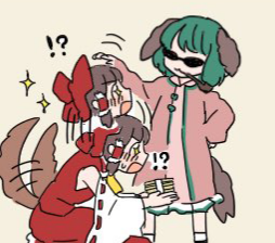 PART II This goes on and on until Yuuka decides she has warmed her up enough. She breaks away from Reimu, who isn't very willing to let her go at first, but then notices Yuuka's line of sight and grins in anticipation. The upper mouth has had enough attention indeed; time to greet the lower one—which is already soaking wet... and apparently, Reimu has come not wearing anything below. Yuuka: "Oh, so you have actually prepared for this? How considerate of you." Reimu: "Well, I AM a thirsty and hungry slut who will easily sell her body to her friends for food. Being friends with benefits has its benefits!" She leans on the wall comfortably and puts her arm around the chair's back. She makes a V sign with her left hand and puts it against her open mouth, from which her tongue is visible. Her eyes have that bedroom look to them, and there's no need for words. A clear invitation it is, too, just like Yuuka's. Yuuka smiles and says, "Well, time to dig in!" She lifts Reimu's skirt and lowers her body. Giving Reimu another lewd smirk from below—and Yuuka was a peerless queen of lewd smirks, I assure you—she slowly brings her face to Reimu's soaking clit and inhales the smell. It is pretty good—a hint of strawberry soap, understandable odor of sweat, and grass. (Was she eating grass again? Oh, poor thing...) There are other faint residual smells from her previous contacts: a mix of sweets and shrooms, a distinct hint of Yukari's perfume, and a man's most faint presence. (Huh...) Satisfied that Reimu has been keeping herself clean despite her lack of money, Yuuka grins to herself, stretches her tongue out, and gives Reimu a deliberately slow lick right between the lips, from where the juices are still trickling. She feels it clench a bit. Oh, so she's on the verge of cumming, isn't she? This raging lesbian must love doing it with other girls. Too. Yuuka smirks to herself again and digs in, immediately attacking the weak spots. She already knows about most of them, if not all, from their previous meetings of this kind. Her left hand rubs Reimu's right breast while also holding the skirt, and the right one tickles just below the left side of her almost perfectly flat belly and where her thigh starts. Reimu responds with a loud, unreserved moan. Yuuka can't see, but a blissful grin emerges on miko's face. She has grabbed her own left breast, roughly teasing the nipple to intensify the pleasure, while her right arm instinctively clenches the chair's back. Her legs are shaking and squirming with each lick. Her face twists uncontrollably. She exhales and inhales at a fast pace, trying to catch her breath to no avail. She winces and looks down on Yuuka who has just pulled her mouth away from her pussy to look up and check her reaction. They make eye contact, and Yuuka, whose left hand has been toying with Reimu's right nipple by this time, immediately shoves her index finger in her mouth. Reimu's lips immediately catch it, and she begins to suck on it fervently, as if it were her mother's breast, or a delicious popsicle... or, okay, a tasty milk sausage. Looking at the way she is bobbing her head back and forth, covering the finger with her saliva... yeah, probably the latter. She's definitely not a good girl. Yuuka lowers her face again and continues to eat Reimu out... but it only takes three or five more licks to get to her limit. Reimu throws back her head, spitting the finger out, and orgasms intensely. Yuuka presses her mouth against the clit and sucks on it, drinking the juices as if they were wine. They fill her throat, and her head gets slightly dizzy, aroused by the pleasure she has given her partner. She has to move her head away before it fills her mind and she goes crazy, but she immediately sticks her finger inside instead and starts rapidly fingering Reimu, sliding it further in and back out, making her squirt more, and scream, and bend sideways, and on top of Yuuka, and back sideways, and arch her back while still trying to hold her grasp on the chair... It looks like Reimu is about to lose her mind. Yuuka slowly lowers the pace until her finger stops at last and, after a moment, sloppily slides out of the wet opening. It makes a "slosh" sound, like a swamp or a muddy puddle. The lips greedily follow the finger, not letting go, and even after they do let go, a thick trail stretches from inbetween them to the finger. Moving her gaze away from Reimu's face, Yuuka looks at her hand. It's completely covered in Reimu's juices. Playfully saying, "Oh boy," she looks up at Reimu's face again and proceeds to lick her own hand clean while looking at Reimu in a way that makes both men and women like them go wild. Reimu looks back at her with a mix of gratitude and arousal. Then Yuuka stands up and puts her body weight on one foot, making a contrapposto pose. She brushes her hair with the hand that's been in Reimu's vagina just a while ago, and with a dramatic gesture offers it to Reimu. Yuuka: "Come! In a hot summer night like this, all this exercising has made us sweaty. We need to wash it all off... and play a bit more, of course. I do expect you to repay the favor, got it, Reimu, dear? ❤" Reimu giggles: "Oh yes! You should look forward to it. Let's make both of us feel good!" She takes the hand—and Yuuka suddenly jerks it back, pulling Reimu out of her chair and against her chest. Without a break, in one continuous motion, she lets Reimu's hand go, grabbing the thigh that didn't even begin to drop down, and slides the hand towards her ass, squeezing it with a firm, almost manly grip. Looking right into Reimu's surprised eyes, she smiles lasciviously. Yuuka: "Indeed. I shall be looking forward to it, my little Reimu." Reimu answers by bringing her face towards her, looking for a kiss. And her expectations are readily met—the lips press against each other, the tongues engage in another duel... Both feel hornier by the moment. Reimu tries to rub her pantyless crotch against Yuuka's tone