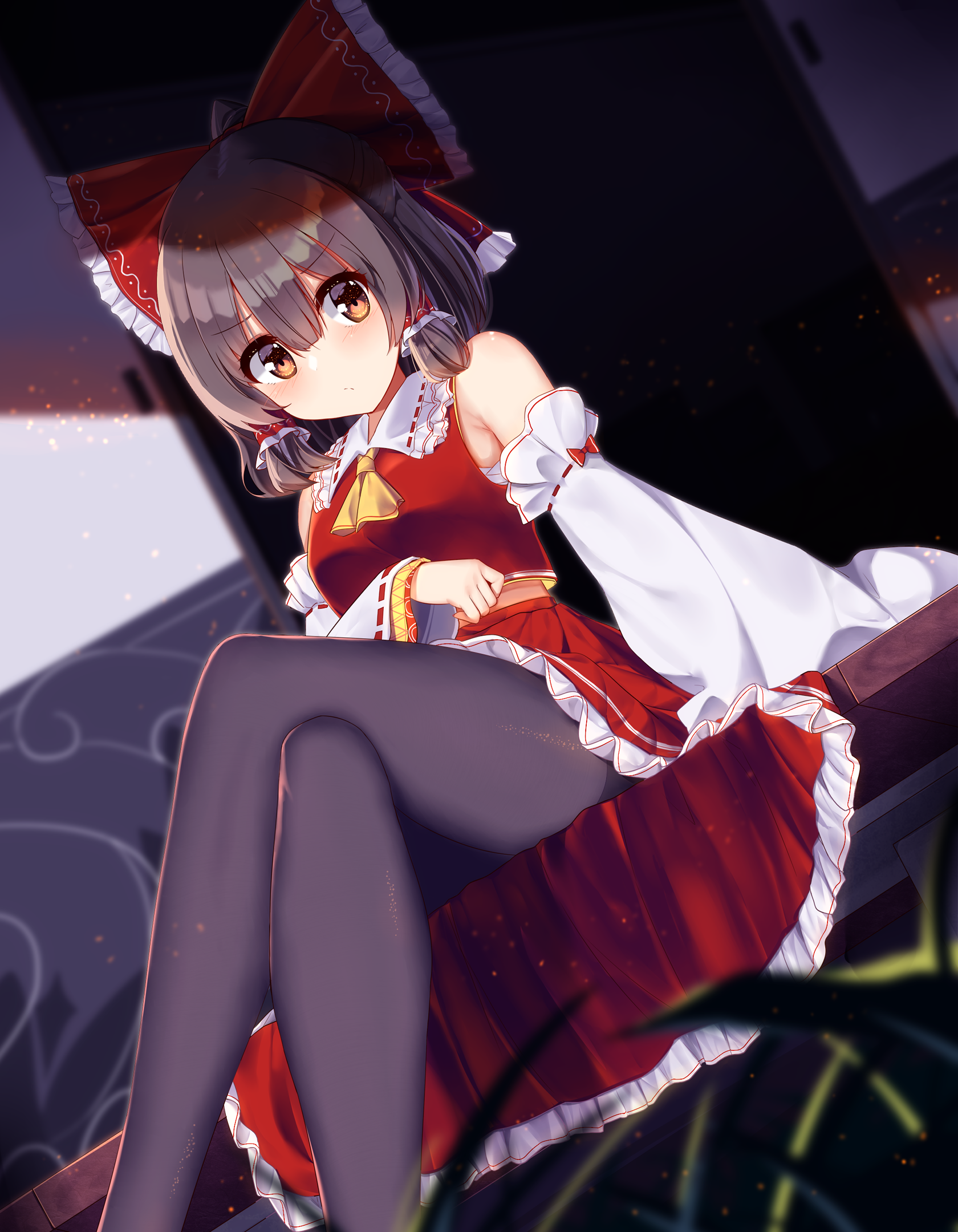 Yuuka: "Ah! I thought up a good idea, Reimu-chan..." She drinks from her glass. Yuuka: "So, Reimu-chan... rises from her seat I wonder if you remember the purpose of my invitation well." Reimu, drunken voice: "Wat puhpos?" Yuuka: "I told you, didn't I? 'What do you wanna do on my bed after a tasteful dinner with French wine?' That's how my invitation sounded. Your being here is the proof that you have agreed." She leans closer. Reimu averts her eyes, abashed. Yuuka: "You do remember it, right?" Reimu: "What, I agreed? ......Aha-ha, well, uh, I d-don't remember that..." Yuuka, leaning even closer: "You're a cute girl, Reimu-chan... Ufufu. Yuuka-neechan can't help but spoil such cute girls." Reimu lets out an embarrassed moan. Yuuka takes her by the chin and gently turns her head towards her. Yuuka: "...Hey, wanna kiss Yuuka-neechan? Tell me. If you don't want it, I'll stop here. I promise." Reimu looks at her with bleary eyes, as if fully submitting herself: "Yuuka... -neechan..." Yuuka: "Aww, so cute! squeals The answer is there in your eyes, I see it. Well then..." And she proceeds to give Reimu a long kiss. Reimu takes the opportunity to hold Yuuka closer with one hand while the other slides in between her legs and begins to lightly massage there. Smirking in her mind, Yuuka brings her thighs a bit closer together, rubbing her groin against the attacking hand, and keeps attacking Reimu's lips. The Red-White moans and tries to catch her breath without breaking the kiss. Yuuka just presses further, forcing Reimu's back against the wall. Finally, the flower youkai slowly lets her go as Reimu opens her misty eyes, her breath ragged. She blinks a couple of times to make the tears go away, then suddenly gives Yuuka an amorous smirk. Reimu: "Mwah...... Ha-ha, yes, I did remember. I've been waiting for this. You are an unexpectedly passive human being." Yuuka: "Human being? I'm a youkai, you know... Anyway, it's more like you were the aggressive youkai between the two of us." Reimu leans towards Yuuka, seductively peeking into her eyes from below. Green light from the youkai's eyes reflects in hers, making them look green as well. Reimu: "Hey, youkai-human-person. I will go on offense this time. Are you prepared? I'm going to show you what I have learned so far." Yuuka gives her an inviting grin. "Sure, go ahead~❤" Reimu slides her tongue out at the same moment their noses touch each other and swiftly puts her in Yuuka's mouth. Yuuka has been expecting something like this, and welcomes her with her own tongue. A fierce battle of tongues ensues, with the battlefield moving from Yuuka's mouth to Reimu's and back. Taking short moments to catch their breath, they immediately rush back into battle, their wet lips barely breaking contact. Saliva drops keep smearing Reimu's crumpled collar and her breasts under the uniform. Both grope each other everywhere they can reach—Yuuka in a mature, firm way, and Reimu with frantic, chaotic touches. Even Yuuka can't help moaning now. This amoral act with another girl has made her fully aroused; besides, Reimu is actually not half-bad with her tongue. At all. She must've been taking lessons from Yukari...