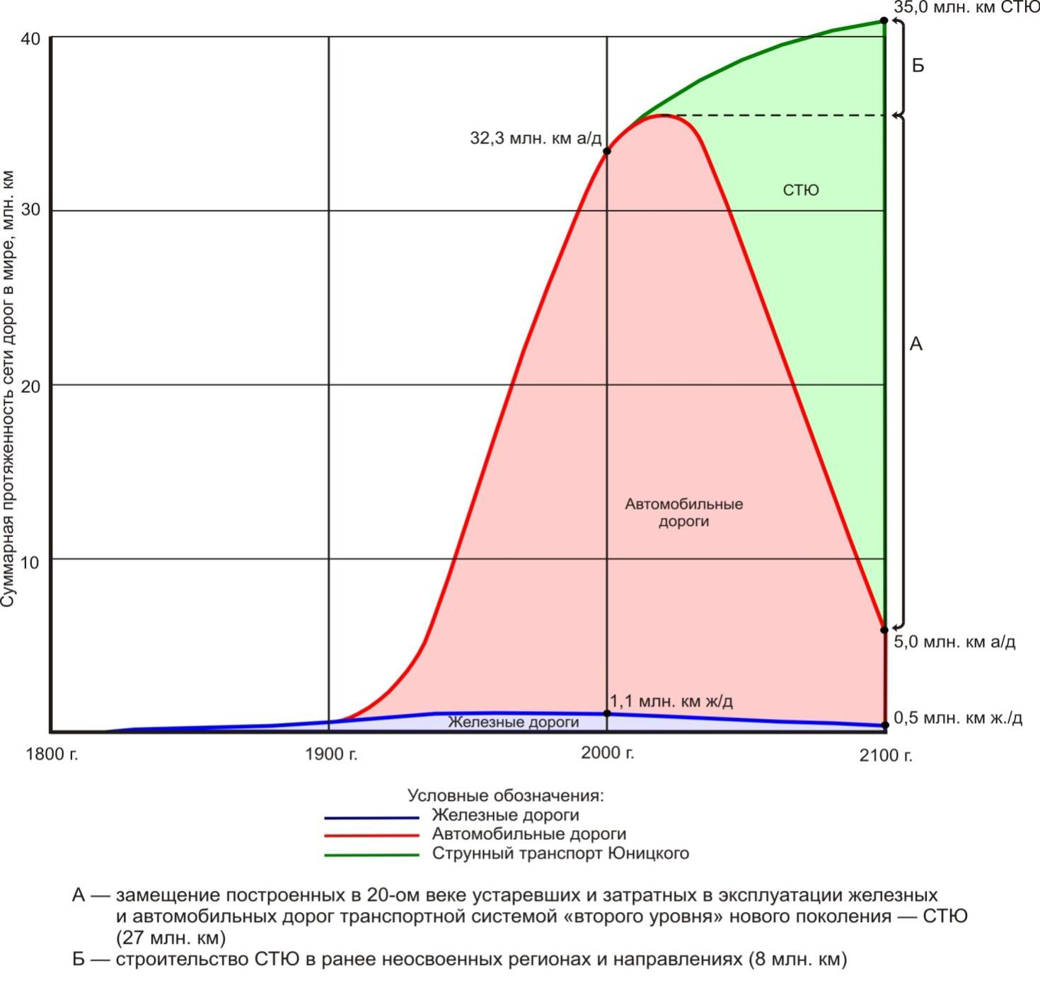Суть в чём: Натягивается два троса промеж столбов, как максимум две трубы с тросами внутри, и по ним начинает ездить мотодрезина со скоростью аж 500 - 600 км/час. Секрет в том, что тросы надо натянуть под усилием 600 тонн (ноу-хау такое). Такая дорога по заверениям Юницкого стоить в несколько раз дешевле обычной. И, знаете, однажды Юницуий торжественно доложил, что им такая дорога уже построена, и аж два года находится в эксплуатации. Правда, всем показывал флэш-мультик про обьычный фцникулёр на табачной фабрике, но главное-то прокукарекать, а там может быть кто и схавает... Сейчас этот клоун якобы что-то делает в Австралии... Пришлось резко съёбывать после попытки незаконной эмиссии акций несуществующего ООО (бабло собирал, сука, ну типа "пирамида").