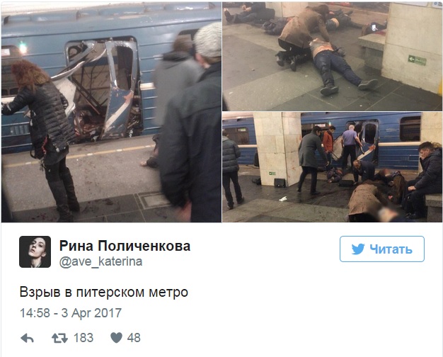 Опять взрывы в метро. На этот раз в Питере Произошли сегодня днём на станциях Технологический институт и Сенная Площадь. Есть как минимум 10 погибших и 50 раненых https://www.youtube.com/watch?v=fjWUB0gtBoE