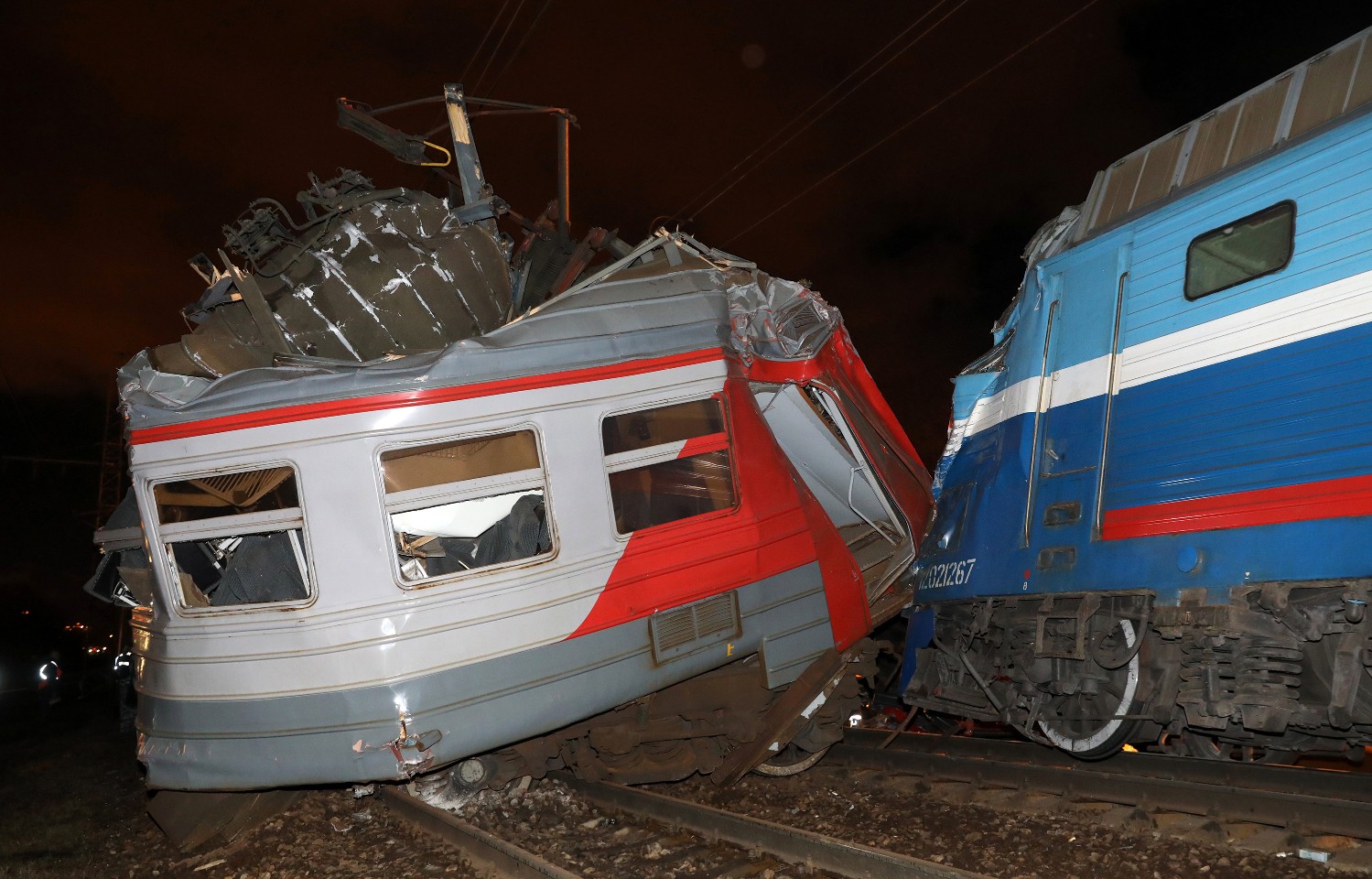 В результате с рельсов сошли два вагона электрички и секция локомотива пассажирского поезда, движение на участке временно приостановлено.
