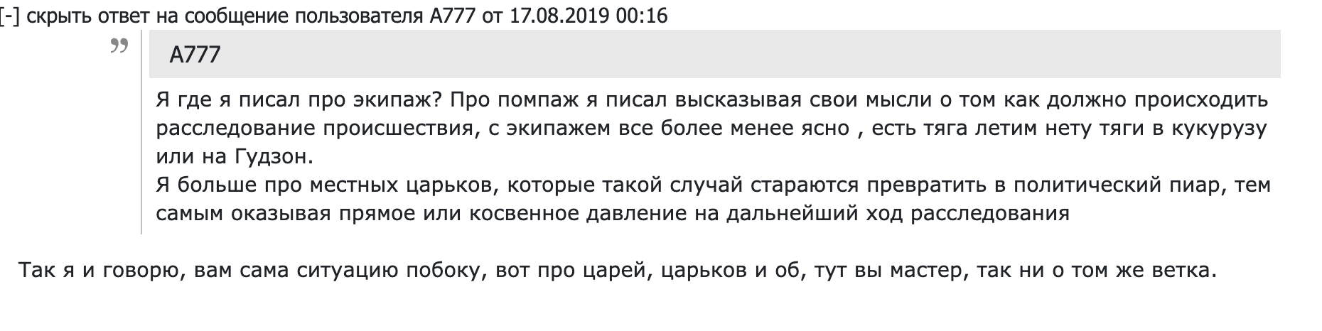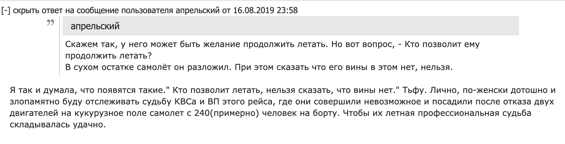 Или у тебя банальная зависть КВСу? Что бывший юрист аккуратно притер самолет в кукрузное поле с полными баками? Салли был психологом по образованию
