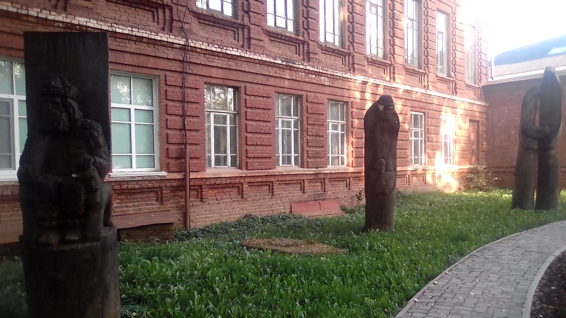 посмотрим как устроен т.н. новый район. Прежде всего тут почти в каждом дворе баскетбольная площадка как в чёрных гетто США. а где-то сразу две площадки. Это не кирпичный забор на первой. там просто перепад высот это уровни разные, это декоративный забор между уровнями - один из элементов авангарда (излишество), при этом свободный проход сохраняется. Даже при том что дома строил стройбат по типовым проектам ускоренным темпом это не спасало от изобретения Пехтиным всевозможных излишеств: полукруглые балконы, разноуровневая крыша с одной квартирой на последнем этаже, или хотя бы кирпичные панно на стенах домов (вторая картинка). обычно изображалась цифра нуль - половина от символа бесконечности, или как называл эту цифру сам Пехтин - зерро (вторая картинка). Зерро присутствует и в шароёбских конструкциях балконов верхних этажей (третья). Ну а нижние этажи изобилуют выступами под клумбы, непонятными входами в подвальные помешения, часто приспособленными под магазины или вот техническими подездами, как на третьей картинке, приспособленными под общественный туалет, тоже изобилующие безсмысленными малыми архитектурными формами