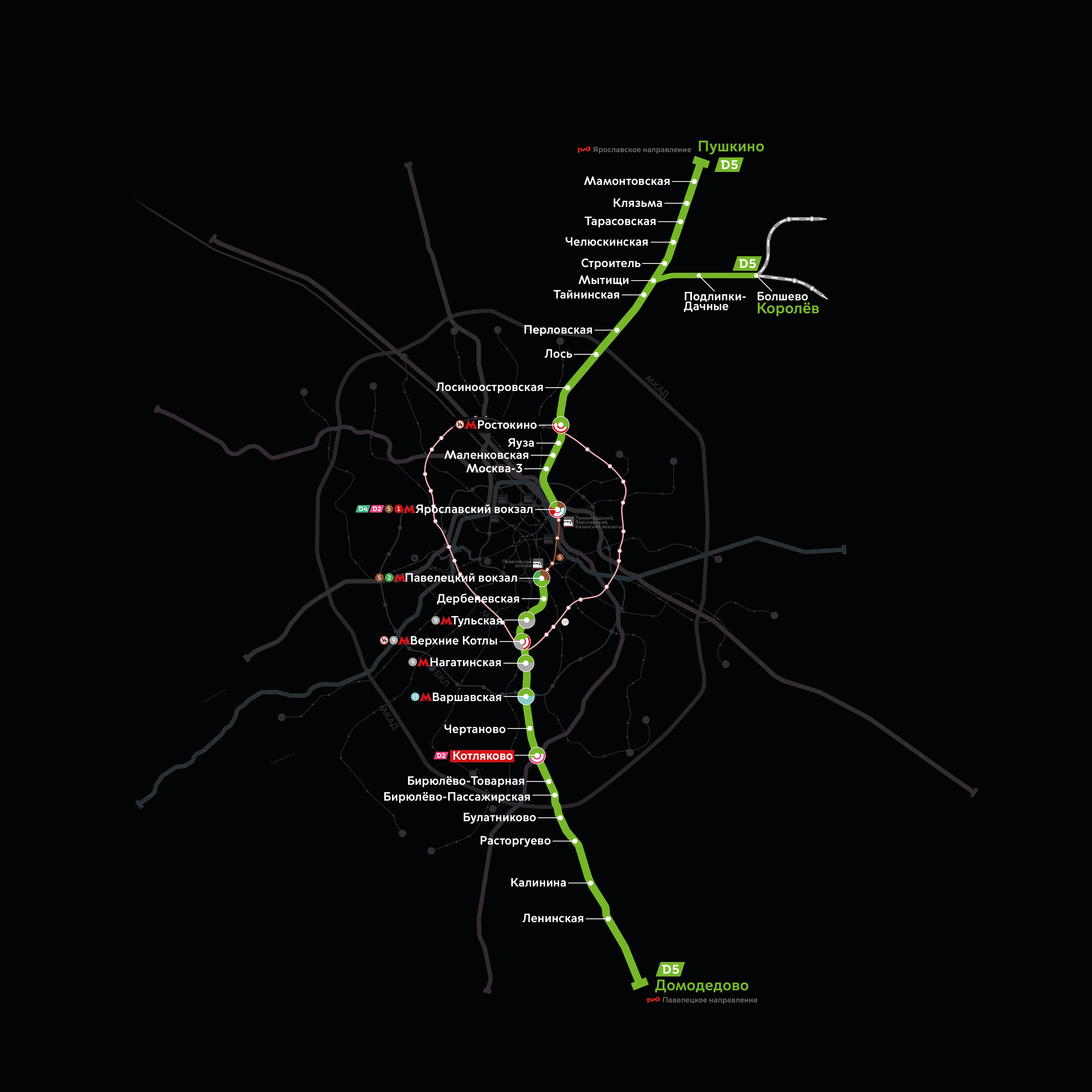 Пятый Московский центральный диаметр соединит ярославское и павелецкое направления электричек, его предполагаемая протяженность составит 89 км. До конца 2023 года власти планируют запустить МЦД-3 и МЦД-4