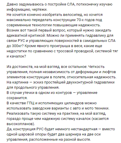 >А это как минимум трубопроводы, фильтра, насосные станция и насос. На СЛА до 300кг нет смысла делать бустерное управление, да и на практике уложить сухой вес самолета даже в 300кг будет не особо реально. Смысл был в простой гидравлике без усилителей -- как тормоза на мотоцикле.