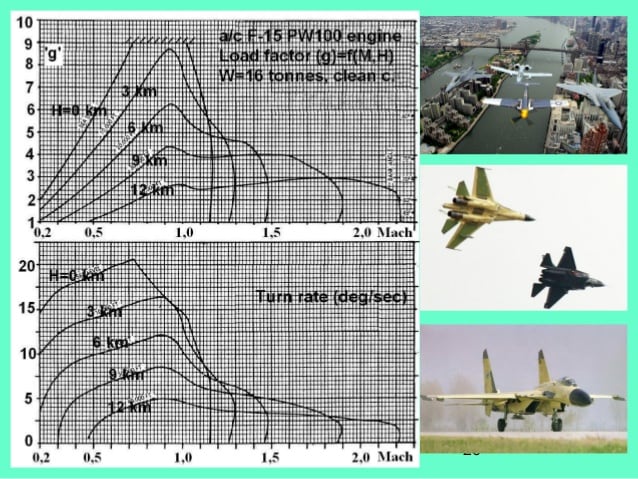 Т.е. самолет на оптимальной дозвуковой скорости (она разная и зависит от модели самолета) будет выполнять вираж быстрее и с меньшей перегрузкой, чем тот же самолет на трансзвуковой или сверхзвуковой скорости с максимальной перегрузкой. Т.к. радиус и время виража зависят от скорости и высоты для каждого типа они выражаются с помощью кривых на графике (см. картинки).