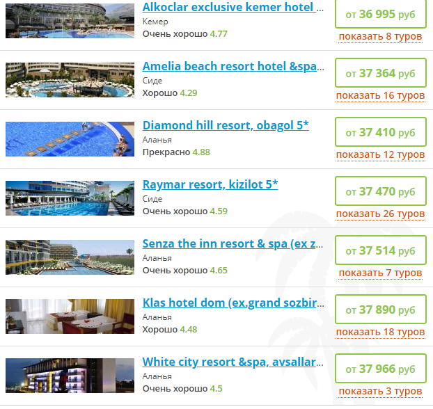 >>67622 если 150 на 1 человека - то ты сможешь зацепить 5* УАИ такто в аланье, анталье и кемере я при поиске банально открываю турвизор и выбираю отели с рейтингом от 4.5 , мне там все нравится в целом, просто далее включаются личные хотелки