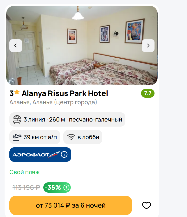 >>45295 Травелата скачай приложение на телефон и покупай тур. Я так там выбрал тур , но очканул оплачивать, в итоге поехал в офис библио глобус в нашем НСК и купил тур у них , что сука характерно у них тур стоил на 1к дороже чем в приложении травелата . Через 10 дней я снова чекнул стоимость отеля на нашу дату по этому приложению и блять у сунмар появилась скидка в 15% на эту дату блять , в итоге я отдал библио 86к за 11 ночей в Гранд Парк Кемере 5* . А мог бы подождать 10 дней и купить в сунмаре за 75 бля (((( ну похуй кто же знал что так будет , поэтому чекай через приложение , по-моему очень удобное . А в этом году в этот же отель цена от 100к , че за блядство