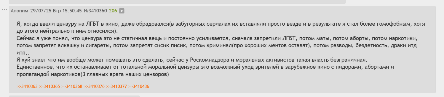 Я, когда ввели цензуру на ЛГБТ в кино, даже обрадовался(в забугорных сериалах их вставляли просто везде и в результате я стал более гомофобным, хотя до этого нейтрально к ним относился). Сейчас я уже понял, что цензура это не статичная вещь и постоянно усиливается, сначала запретили ЛГБТ, потом маты, потом аборты, потом наркотики, потом запретят алкашку и сигареты, потом запретят сисик писик, потом криминал(про хороших ментов оставят), потом разводы, бездетность, драки итд итп,. Я хуй знает что им вообще может помешать это сделать, сейчас у Роскомнадзора и моральных активистов такая власть безграничная. Единственное, что их останавливает от тотальной моральной цензуры это возможный уход зрителей в зарубежное кино с пидорами, абортами и пропагандой наркотиков(3 главных врага наших цензоров)
