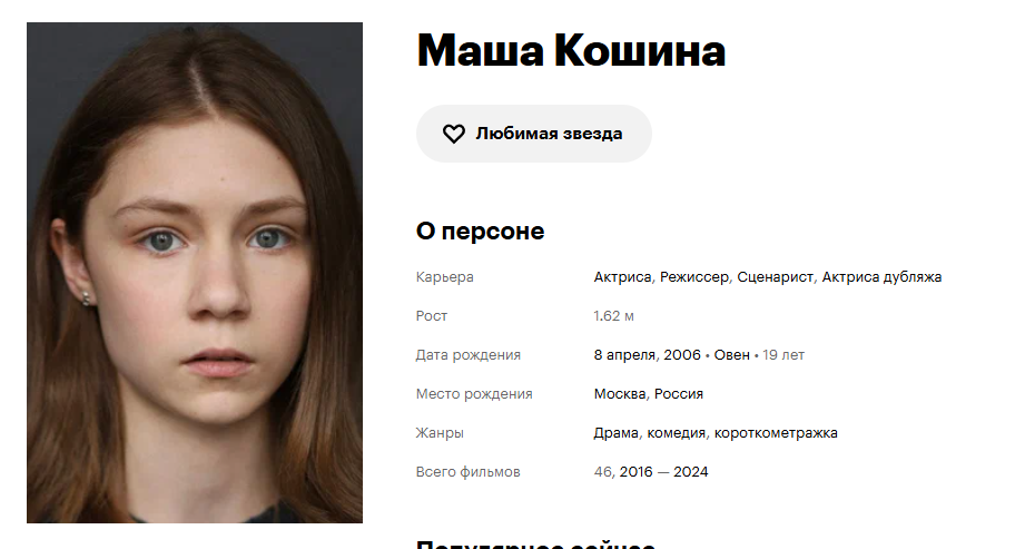 >>3493975 Думал, авторы ебнулись, но актрисе на момент съёмок лет 25, а сейчас уже лет 30. Она вожатая, а не пионерка. Ангелина Стречина очень красивая. Видел из её фильмографии только "Домашний арест" и "Аванпост", где у неё второстепенные роли. Добавил в свой топ красивых актрис, наличие которых в фильме является решающим фактором для просмотра.