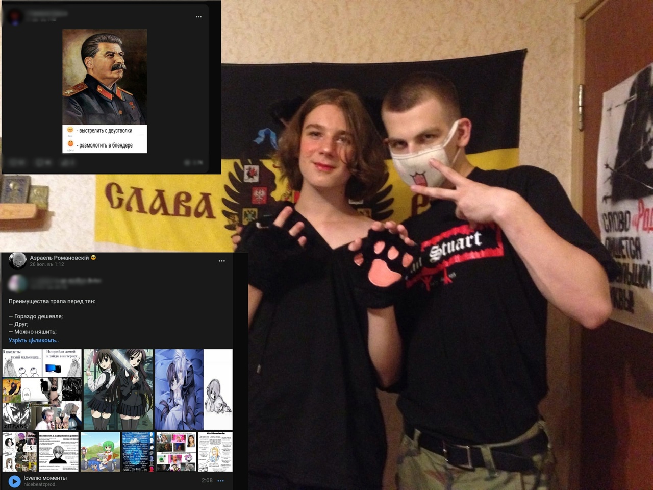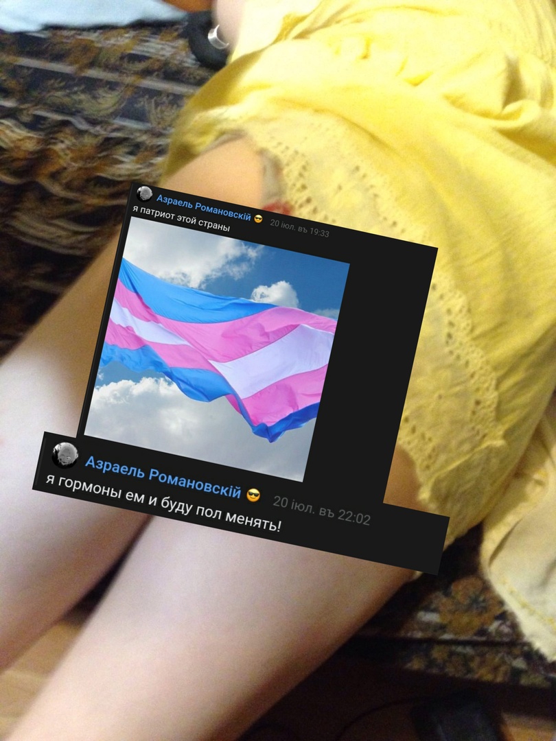 На данных фотографиях вы можете видеть Славку Ткачука , "Азраеля Романовского", правого националиста антикоммуниста и человека который в своей группе в вк оправдывал коллаборационистов РОА, оскорблял ветеранов и поддерживал украинских нацистов из батальона азов, он стоит слева на первом фото. На фотографиях он переодевшись в женское платье обнимается со своим бритоголовым парнем. Скин, кстати, и похвастался своими успехами с этой милой правой "девочкой" перед своими соратниками, скинув при этом и его контакт в вк. (Друзья из правого движа видимо тоже познакомиться захотели ;) ).