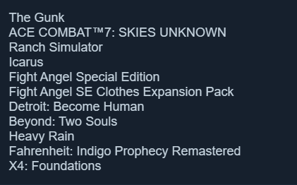 Беру только те игры, в которые планирую играть либо сейчас же, либо в самое ближайшее время, обычно 3-4 штуки. Следующая большая распродажа будет весной, там докуплю что действительно будет мне нужно. А то так однажды накупил охапку игр, которые до сих пор не запускал даже, а они уже продаются с бОльшей скидкой, а в некоторые я чет перехотел играть.