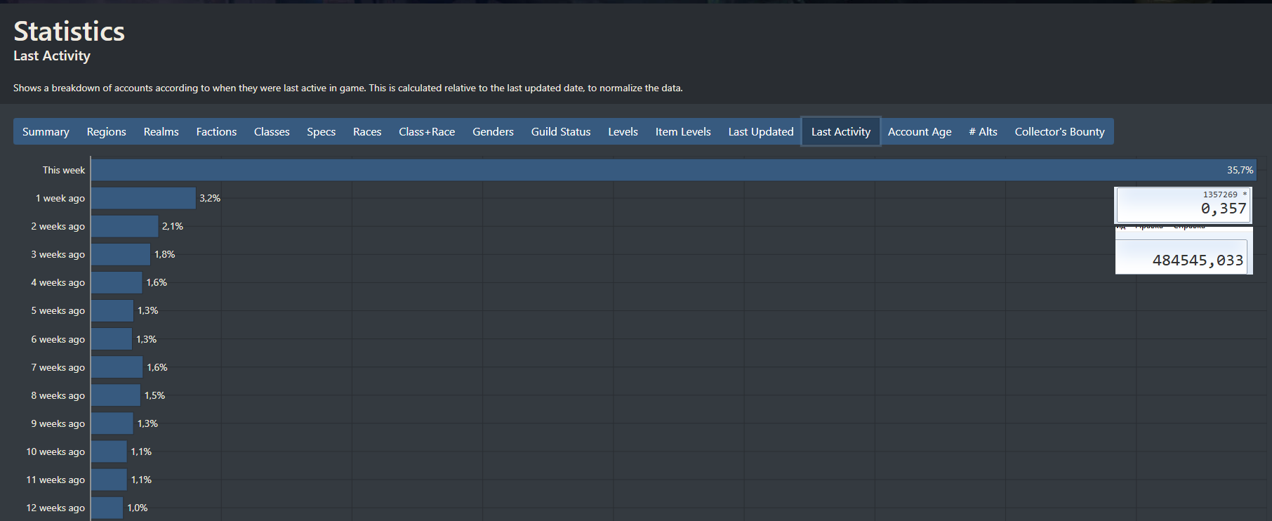 >заявляется 9 миллионов онлаин (выше чем у фортнайтов и контрструков) >30к на твиче в прайм >1.5 миллиона аккаунтов за 2 года >менее 500к активных аккаунтов за неделю (~50к пик онлаин ежедневно) >1.5к тредов на двачах за 8 лет >половина постинга - думпостинг унижающий ворло варкал