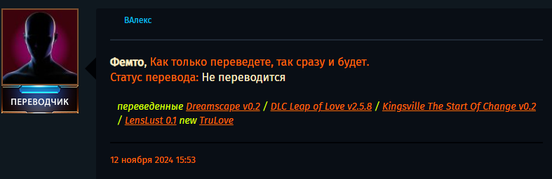 >>50454489 И причём тут Акабур? Ты дурак? Это просто какой-то рандомный переводчик, который забавно оценил стоимость своего часа. Сам маэстро перестал переводить игры задолго до звёздного канала. >>50454610 Услышал вброс и распространяешь его, молодец. На страже говна в интернете.