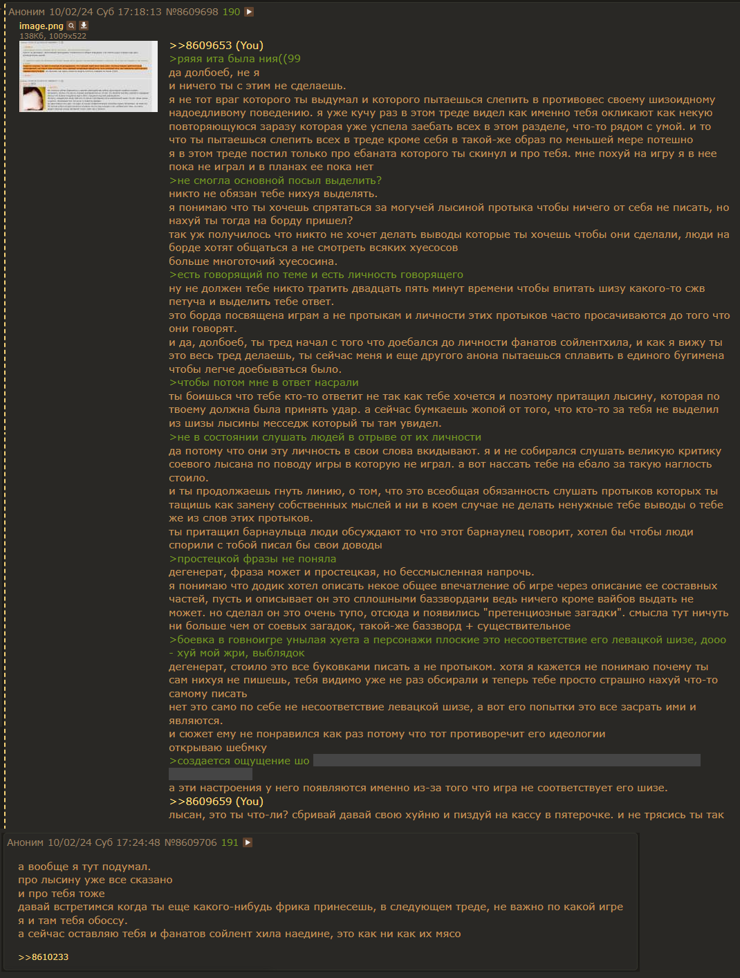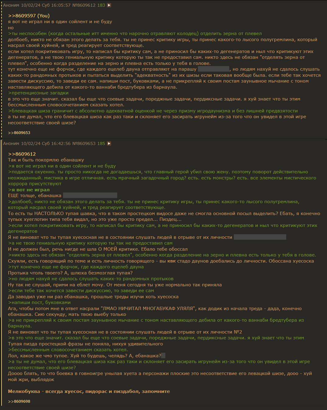 Ору с местных чмонек, им основополагающий базированный разбор принесли в котором абсолютно четко разъясняется, что сайлент хил два - говно для полнейших хуесосов и пидорасов, а они давай подрываться да тупостью тралить перекрывая боевыми картиночками, смихуечками, доебками до внешки говорящего (просто пиздец, такие уебаны), и вовсе стали выдумывать ебалу которой ни в сюжете ни в обзоре отродясь не было. Настолько глубоко в свой манямирок нищий залезли в рамках которого этот хорошая игра, лошки ебаные