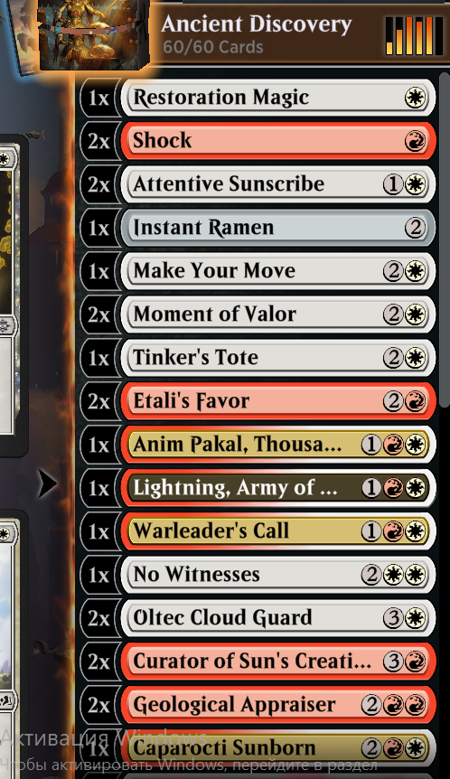 Вот вы говорите, моноред, моноред, а я смотрю, все три с половиной анона в треде заскучали, так что разряжу обстановку и вкину смешной декбилдинг из говна, палок и стартеров. На картинке одна копия Scorching Shot не влезла, в сайдборде по две штуки Abrade, Vengeful Possession и Daring Discovery и один Turn Inside Out хотя пока вообще не вкуриваю, нахуй сайдборд в колоде для bo1. Интересно услышать комментарии.