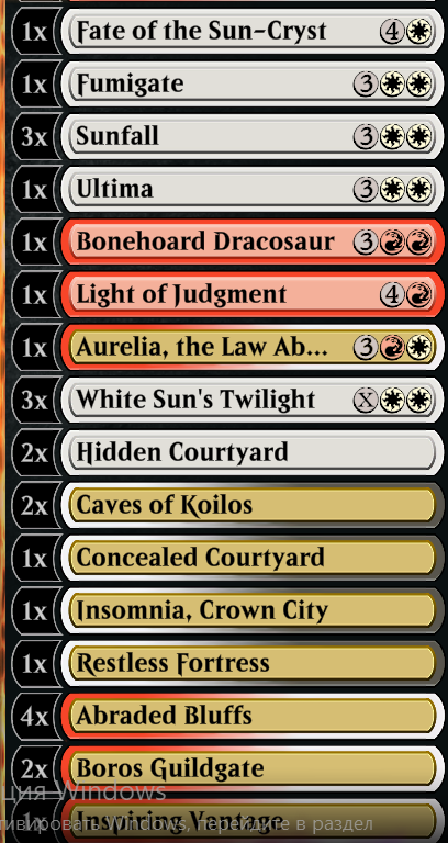 Разжился одним Undead Sprinter и пачкой Disturbing Mirth после драфтов как и предполагал, Пересобрался в пик 1, теперь как будто больше шансов в ранее проигрышных матчапах, но где раньше без проблем выигрывал, стало тяжелей. Появились ещё вопросы: - сколько ремувалов разной весовой категории необходимо для колоды подобного уровня агрессии? Условно, вот есть один Bitter Triumph и два Shoot the Sheriff, всё на инстантной скорости и убивалки почти безусловные. Взял пару Final Vengeance, раз теперь появилось больше целей под жертву - но они уже медленные. А есть например Nowhere to run - тоже инстантный, чёрный цвет её активно юзает как я заметил даже в констрактеде, но это чисто ружьё на кабана, против толстых бивней типа шеолдред, или демонов каких-нибудь, или всякой зелёной хуйни 12/12 это не работает, даже достаточно популярного в наших широтах (платина) вампира 2/4 не возьмёт. Ракдос отсюда >>49086592 использует аж 9 штук, но это ведь колода заметно медленней, она не приспособлена леталить на 4 ход с широкого стола, она может себе позволить держать в руке всякое ситуативное, а давление обеспечивают ужасы и спринтеры почти без траты карт. - В коллекции есть пара Vial Smasher и один At Knifepoint. Куда их пихать тут - совершенно непонятно (а насчёт At Knifepoint есть также сомнения в её эффективности; с другой стороны, это тоже многоразовая плодилка токенов), я даже вторую копию Unstoppable slasher'а не придумал куда девать. Подумал-подумал, решил, что "брейся - не брейся, а на ёлку не похоже", сделал версию безо всяких попыток в пожертвования и прокрутки, просто честный битдаун (пик 2), и он как будто даже более последовательный, хорошо расставляется, с правильной манакривой, даже во вторую платину получилось на нём заехать, которую безуспешно штурмовал последние пару дней. Наверное, как-то так бы выглядел нормальный стартер ракдосов, если бы издатели Арены не были бы жадными мудаками. Вопрос: на каком ресурсе лучше всего поискать старые бюджетные деки? Не нынешние, а именно то, что актуально было во времена выхода Outlaws например? Понятно, что ротация-хуитация, но мне просто как образцы, от которых отталкиваться.