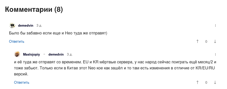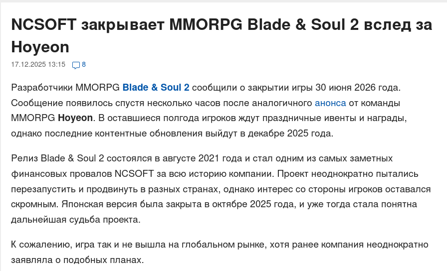 Пытался нагуглить, понял только что в 2024 еще евро БНС лайф во всю работал, хоть и тухло там было, а в 2025 раз и вместо него по ссылке той же НЕО. Как это произошло? Где хоть упоминание закрытия серверов. И главное, какие основания считать что у нас не сделают так же. Допустим в сентябре откроют НЕО, а в октябре тихо закроют лайф.