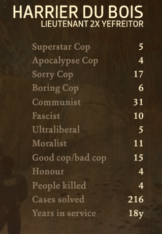 Да бог с ним с лором. Тут вопрос в экспириенсе, зависящем от личностных качеств. Как именно твой коп закоупит с потерей любимой стервы, с какого ракурса сможет увидеть мир, а где будет ограничен и слеп. Так-то не зря у игры самый первый слоган был - "какой ты типаж полицейского?". Её основная цель не в лор тебя погрузить.