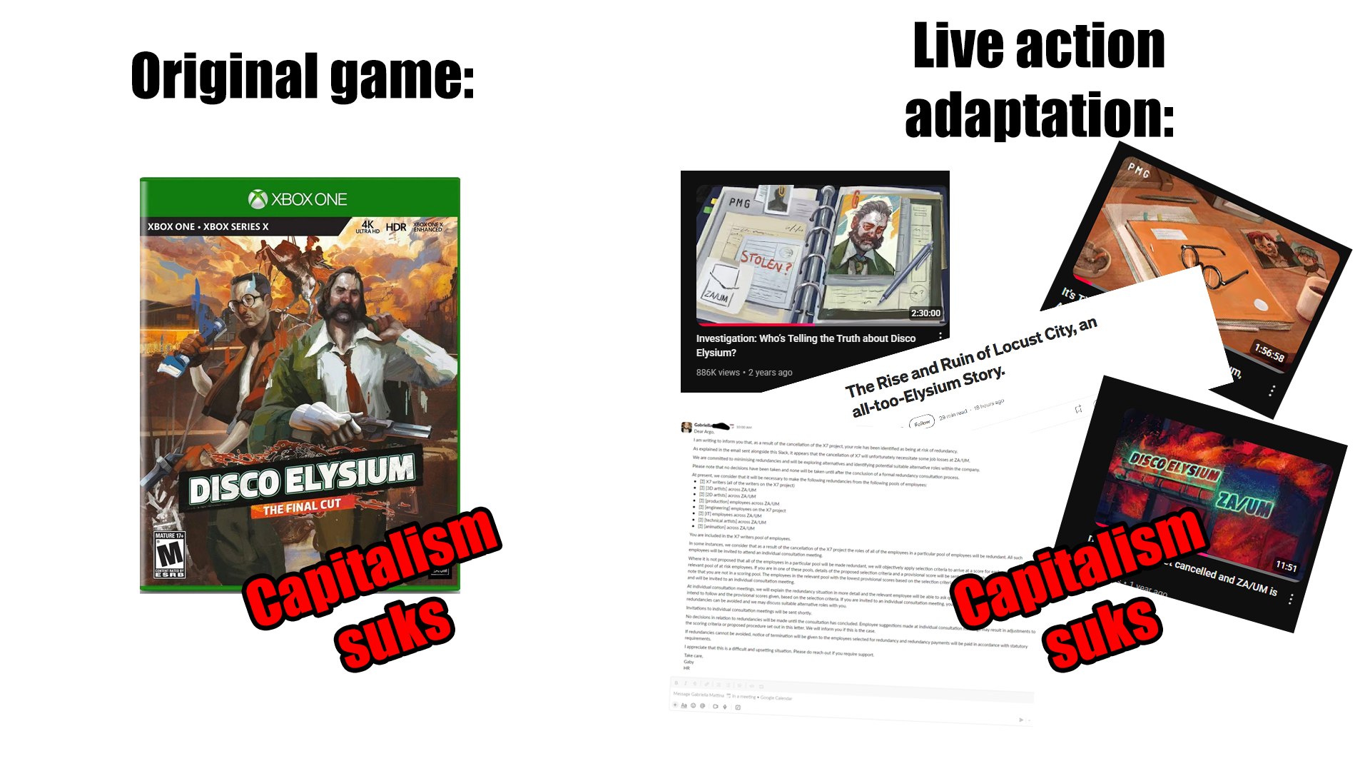 >>50650417 Это все прикольно, но Зеро парадес происходит вообще в другой вселенной и с Диско Элизиумом имеет разве что общие спизженные концепты которые 100% видоизменены из за череды судов с Курвицем.