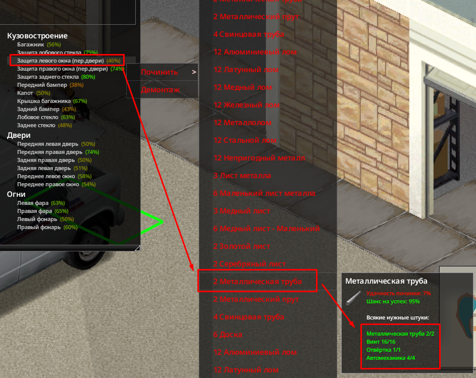 Ясно В переводчик сами прогоните NEW • Reordered hit location damage calculation to occur after body part selection by ballistic • Ranged weapons can now use damage modifiers specific to each body part. • Fixed a shotgun aiming bug. Zombies were dodging the projectiles. When aiming at a specific body part, the other projectiles mysteriously disappeared. Now all projectiles are calculated correctly— every zombie gets what it deserves • These changes impact how shotguns work and feel in the game. • Added cone of vision opacity slider in performance settings. • Updated the cone of vision to use external square lighting when it is brighter than the daylight value, allowing the player to benefit from streetlights and other sources at dawn, dusk, and night. • Updated the lighting system so that rooms behind closed doors are completely dark. • Added more tiles for Breakable Metal Fences. • While resting, the Endurance moodlet now functions as a progress indicator. • Updated pathfinding to allow players to plan paths over climbable walls during "Walk to when wall can be climbed." • Added models, textures and model keys for muzzle flashes. • Players can store bodies in the trunk or in the seats of the vehicle. • Added "required items" and "sort by name" options to crafting Uls. "Sort by name" has been renamed to "Alphabetical (A-Z)". • Cigarettes can be smoked directly from the pack without having to remove them first. • Liquid containers that require opening for consumption will now have a "Drink" option (if the player can open them). Selecting this will execute the opening recipe before drinking. The context menu option is now "Open and Drink" instead of just "Drink." • Canned food that needs to be opened for consumption will now have an "Open and Eat" option, which will run the opening recipe before the eating action. • Similar to double-clicking on food, which causes the character to eat it, now double-clicking on pills and consumables like chewing tobacco will cause the character to consume them. This does not apply to rat poison (to prevent accidental death). • Double-clicking on drinks makes the character drink, opening the container if necessary. • Double-clicking on water makes the character drink if he is thirsty. • Improved automatic highlighting of the first recipe in the crafting search. Now only the recipe selected by the player is highlighted. • Added player-visible poisoning/contamination rating to prevent players from drinking double-clicked liquids if they are poisoned/contaminated. • Added SHIFT + CLICK in the list of available ingredients (Windows style selection). • Added CTRL + CLICK on the header to select everything inside it. • Crafting/building menus now close when the character moves. Added a lock button to the Crafting and Building windows to prevent them from automatically closing when walking. • Crafting/building/entity interfaces now save and restore size/position between loads. • Items marked as unwanted will be specific (individual media or books) and not entire categories. • VHS tapes that have already been watched will have "(Watched) in their name, CDs that have been listened to will have "(Listened). • When trying to light a fire with a carved plank without fuel, the option will appear in error color with a hint explaining that it needs fuel. • An exhausted player trying to light a fire with a carved plank will see an explicit hint and an error-colored option instead of the missing option. • Worms in compost bins now reproduce in winter if the compost bin is considered "indoor." • Individual inventory items can be marked as unusable in crafting recipes. crafting/building (and this tag can be removed). • Added title bar buttons to the loot window footer. • Added contextual loot buttons to remove fire pits and drop bodies on unlit fire pits. • Added filled models for Ceramic Bowl, Glass Jar and Cup. • Improved tooltips and list of possible liquids in the manual crafting tab. • Low-level cookbooks added to kitchen loot • New "Crafty" trait: 30% XP bonus to Crafting skills only. Exclusive to "Fast Learner" and "Slow Learner", costs 3 points. • Added option to browse recipes that an item can be used for by right-clicking on it. • Players can rename containers on tile objects. • Added "possible ingredients" feature to the Construction Menu. • Color bars in item tooltips now use "good" or "bad" color according to benefit or penalty (running speed, combat, discomfort, etc.). • Inventory items that affect Stamina, Fatigue, or Stress when consumed now use colored bars instead of numbers. • Items that affect Vision or Hearing when used show colored bars (bad or good), not color scales. • Hay can now be removed from hay blocks. • Added text "No recipes available if there are no recipes. • Slight optimization when evaluating whether an inventory item is a revenue input. • More rigorous assessment of whether a rubble tile can be "simply collected". • Added filled templates for Fountain and Plastic Cups. • Added recipe for making mirror. • Cookable foods show cooking time in the tooltip if the player has a 5+ Cooking skill. • When viewing the trunk inventory from outside the vehicle, there will be a top button to close the trunk. If the player has the key, they can also close and lock it. • Animal corpses now appear highlighted in the Animal Designation Zone Ul. • Cake Pan can now store liquids. • Added a crafted version of the Glass Jar and updated the recipe to craft it instead of the looted version. • Added background to radial menu text for better readability. • Microwave/oven buttons renamed from "Cancel" to "Close". • Controller focus set to profession list when opening character creation. • Controller focus set to character panel when opening creation screen. • Added visual transition when using left shoulder to switch Ul 