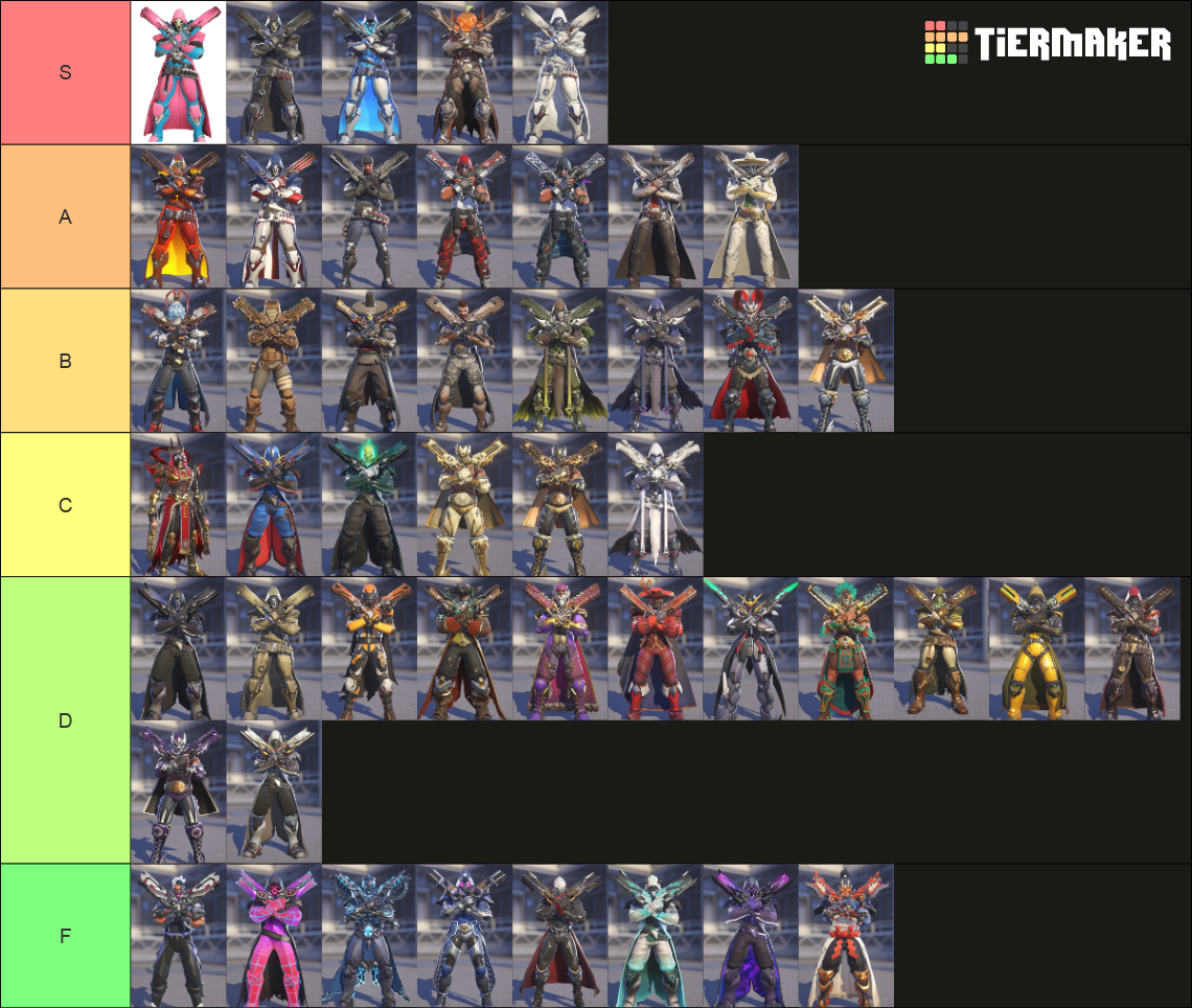 я беру свои слова, маскарадный скин это не D-тир. меня пиздец бесили вот эти сардельки вместо ног, поэтому я скин максимально не принимал, но так-то на повторном рассмотрении он пиздец охуенный. перемещаю его в A-тир