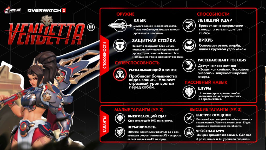 🔘Оружие «Клык» — двуручный меч из жёсткого света. После комбинации взмахов наносит урон по доп. здоровью. 🔘«Защитная стойка» — Вендетта совершает блок мечом, уменьшая получаемый фронтальный урон и отражая атаки ближнего боя. Поглощение урона расходует энергию. 🔘«Летящий удар» — бросает меч в направлении взгляда, а затем подлетает к нему. 🔘«Вихрь» — совершает рывок вперёд, нанося круговой удар мечом. 🔘«Рассекающая проекция» — доступна пока активна «Защитная стойка». Поглощает энергию и запускает широкий снаряд. ⏺️«Раскалывающий клинок» (суперспособность) — пробивает большинство видов защиты. Наносит огромный урон врагам перед собой. 🔘«Штурм» (пассивный навык) — наносите урон врагам, чтобы увеличить свою скорость атаки и передвижения.