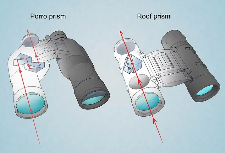 Ликбез по биноклям. Есть джве оптические схемы: Призмы Поро, патент итальянца хуй знает какого года. Схема на полном отражении (школьная физика привет) внутри призм. Габариты больше, шире стереобаза, в теории без светопотерь на отражении. Технически сложно сделать по настоящему герметичным. Схема "крыша" (roof). Потери на переотражении внутри призм, несколько возможных схем. Тёмноё пятно на картинке, если глаз направлен не строго по оптической оси. Могут быть полностью герметичными. Все остальные схемы являются антикварым устаревшим говном.