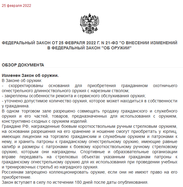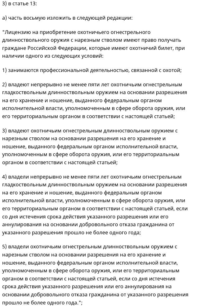 >>848040 Я тебе текст поправок припёр из закона, какой ещё "закон" ты мог читать? И как ты себе в принципе представляешь систему, в которой по одним делам оружие будет проходить как нарезное, а по другим — как гладкое? Там максимум вопросы могут возникнуть только уровня: "Почему ствол не отстрелян?", не более.