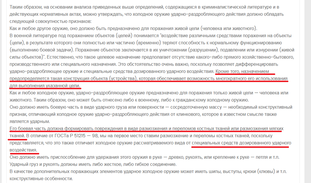 >>855967 >под ХО его нельзя подписать >ст. 6 закона 150 ФЗ >метательного броскового оружия, кистеней, кастетов и других специально приспособленных для использования в качестве оружия предметов ударно-дробящего и метательного действия, за исключением спортивных снарядов и указанных предметов, имеющих культурную ценность и используемых в культурных и образовательных целях Чуха читай закон блжад. Телескопы, кукотаны и пр, в случае самообосранства, эксперт с вероятностью 99% определит как х.о. удачно дробящего действия. А все ударно дробящее запрещено к гражданскому обороту.
