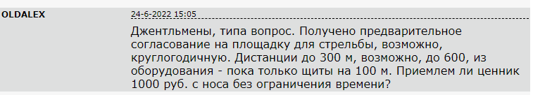 >>863277 >тема на ганзе Спасибо за наводку, как раз есть тема, где обсуждают возможность стрельбы в Краснодарском крае. В общем-то всё довольно печально (как и в большинстве городов, думаю). Есть неплохой вариант за 600 рублей в час, там расстояние не больше 50 метров (а что ещё надо с двустволкой), либо как раз вкатываться в пристрелку на ОДОУ. На пикриле вон вообще кто-то в процессе запила стрельбища, но говорит, что не близко к Краснодару