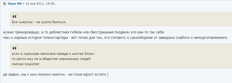 >>994896 Всем кричащим "сажать надо!!!11" советую расслабиться - не сажают за такое на практике, примеров видел массу :) Да и если бы за звиздюли у нас сажали - некому было бы и тюрьмы охранять, почти вся страна бы сидела :D Тренироваться надо, да, и не считать, что любой противник - лох. Что касается Блэки - знаком с ним лично, милейший человек пишет унтерменьш цьема там же и тогда же